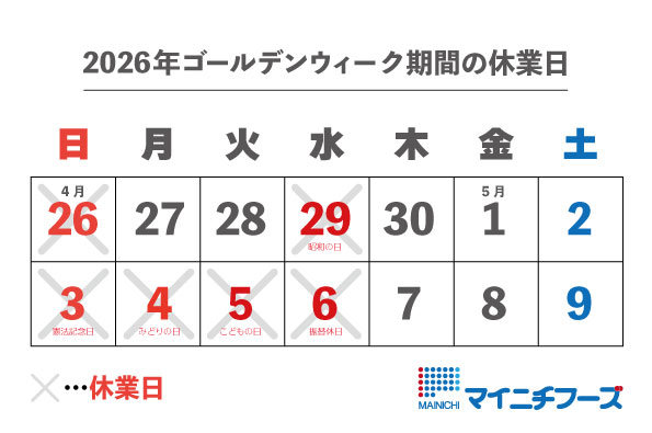 2026年5月3日(日)~6日(水)の休業期間中にいただきましたお問い合わせ・ご注文、並びに会員登録のお申し込みに関してのご対応は、翌営業日7日(木)以降のご対応とさせていただきますのでご了承ください。