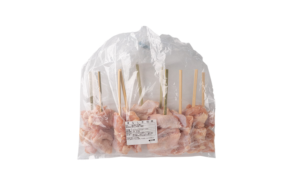 手羽先の骨を自社工場で全て取り除き、串刺しのスペシャリストにより完成するこちらの手羽串。
